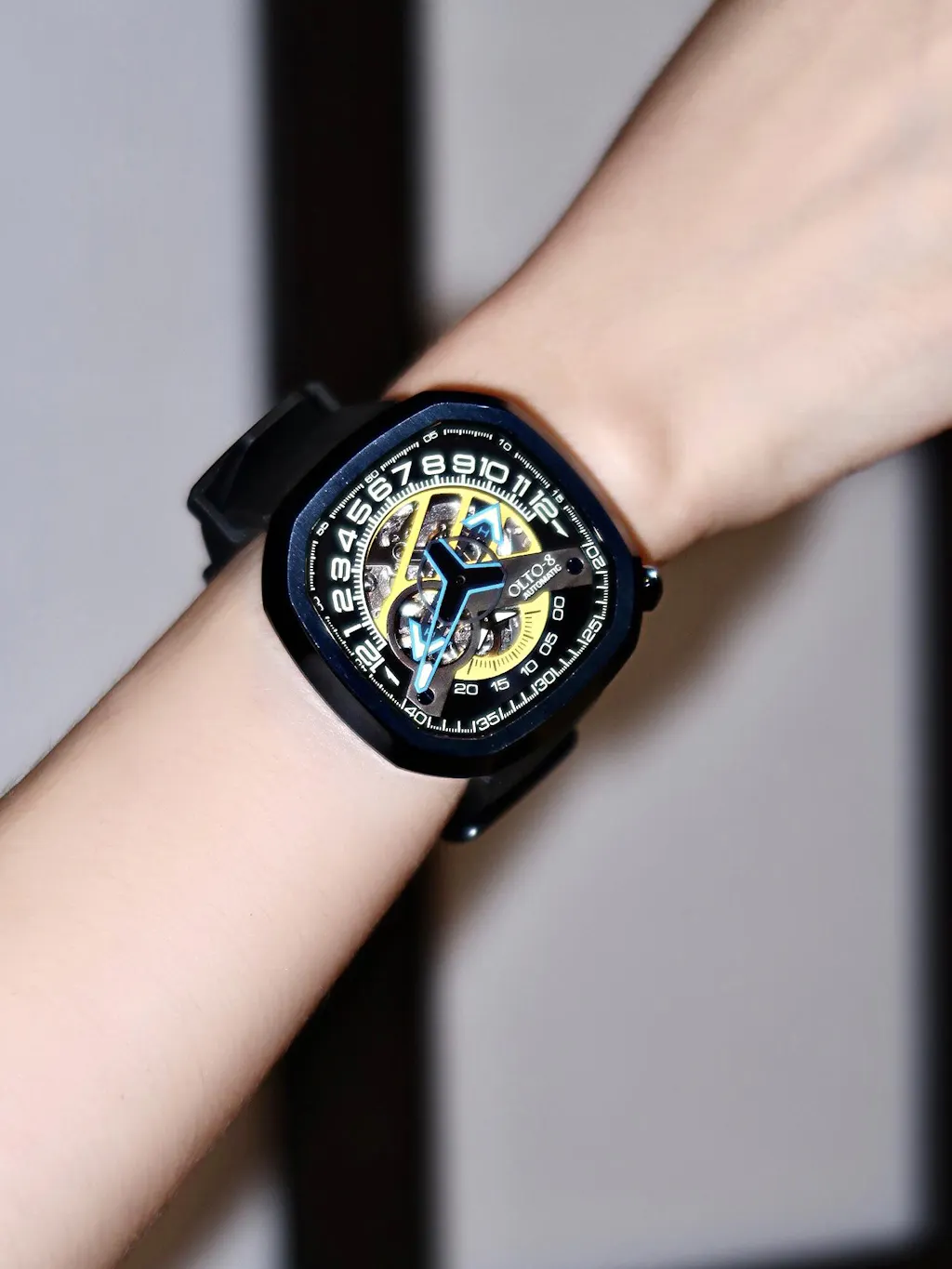 INFINITY II の時刻表示は、他の自動巻き時計とは一線を画します。独自の5層ダイヤルレイアウトを採用し、アワー(内側上部インデックス)、ミニッツ(外側円形インデックス)、セコンド(内側下部インデックス)を表示します。時計はマルチハンドシステムを備え、180°配置の2本のアワーハンド、特殊な三角形形状の1本ミニッツハンド、120°配置の3本セコンドハンドが特徴です。これらの特徴により、非常にユニークで目を引く時刻表示が実現され、INFINITY II はまさに会話のきっかけとなるでしょう!