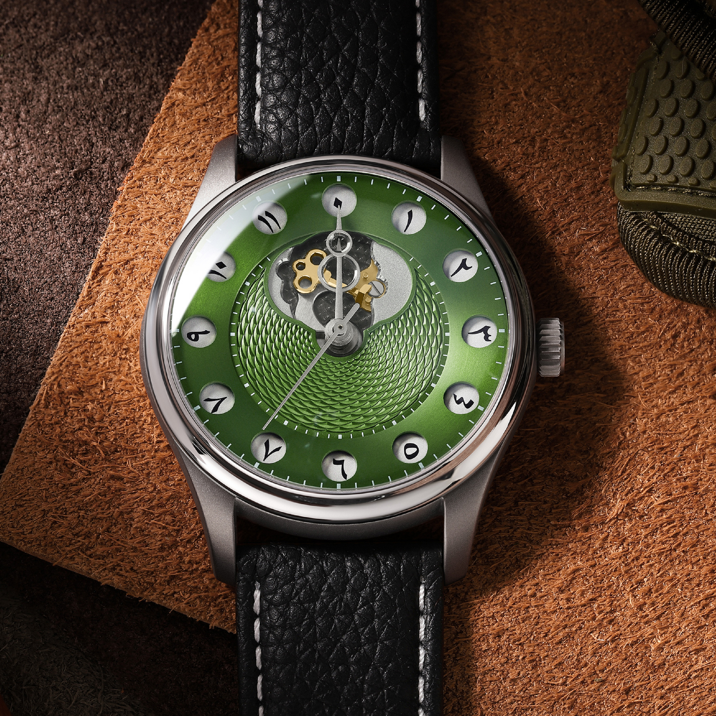 Introducing OLTO-8 Chrono Gate Olive Green — a refined interpretation defined by Middle Eastern numerals, an engine-turned guilloché rotor, and carefully finished movement details.